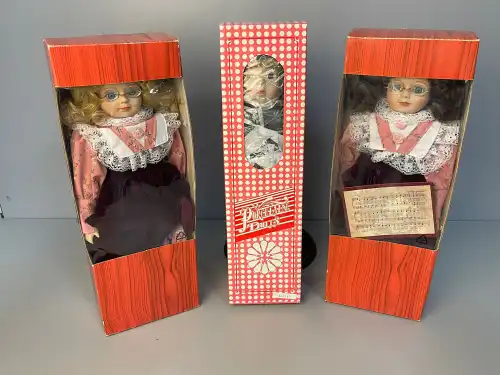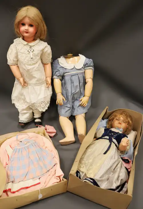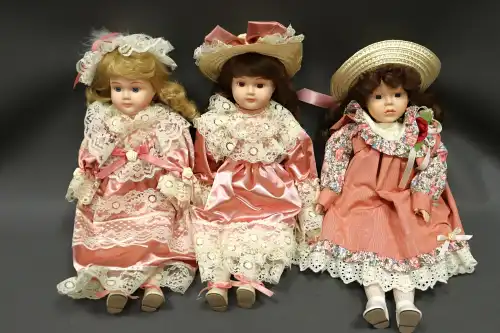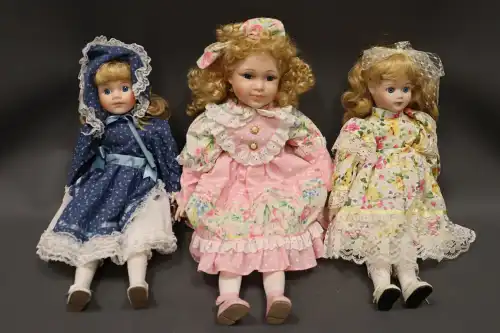 Lot de trois poupées en porcelaine et tissus, semi-articulées, yeux ouverts, bouches fermées, sans marque apparente. L'une à robe bleue, l'autre à robe rose et la dernière à robe à fleurs. Dans leurs boîtes d'origine. H. : 40 à 46 cm
