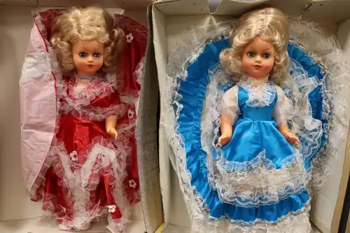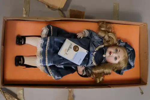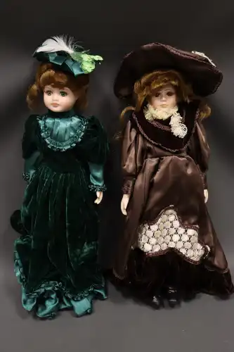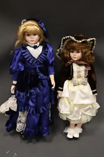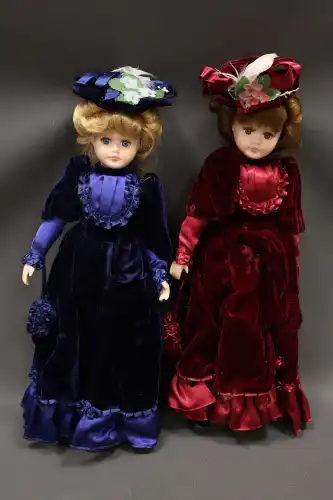 PORCELAIN DOLL. Lot de deux poupées en porcelaine et tissus, semi-articulées, yeux ouverts, bouches fermées. Dans le style Victorien, à robe bleue et rouge et chapeau à fleurs. Dans leurs boîtes d'origine. H. : 47 cm à vue