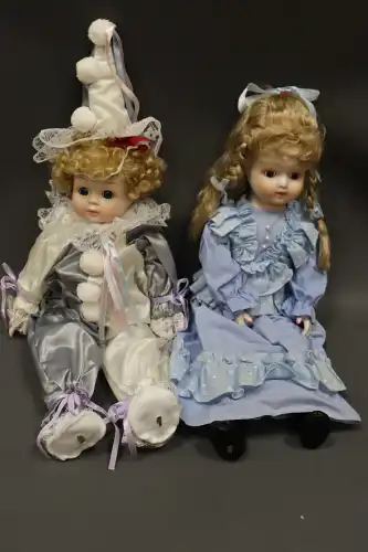 Lot de deux poupées en porcelaine et tissus, semi-articulées, yeux ouverts, bouches fermées, sans marque apparente. Une poupée représentant un arlequin à costume blanc et gris et l'autre à la robe bleue. Dans leurs boîtes d'origine. H. : 42 et 45 cm
