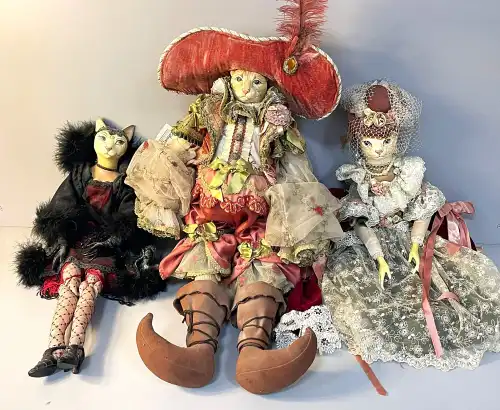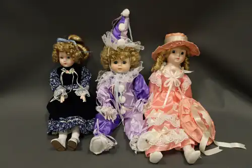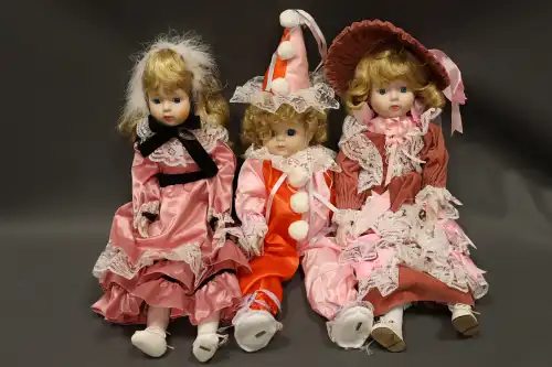 Lot de trois poupées en porcelaine et tissus, semi-articulées, yeux ouverts, bouches fermées. L'une représentant un arlequin avec costume violet, l'autre à robe et chapeau roses, la dernière à robe bleu marine. Deux poupées dans leurs boites d'origine. H. : 41 à 48 cm