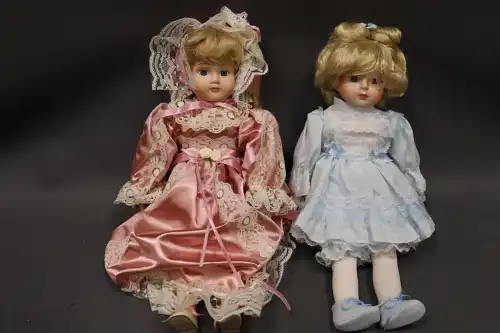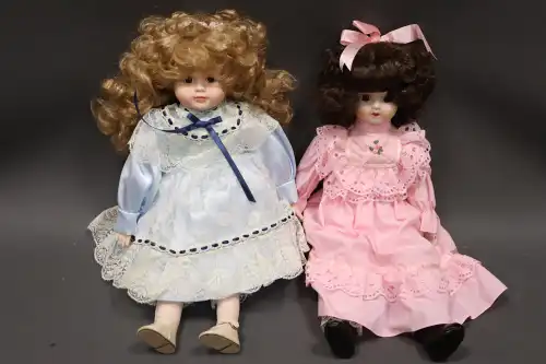Lot de deux poupées en porcelaine et tissus, semi-articulées, yeux ouverts, bouches fermées, sans marque apparente. L'une à la robe bleue, l'autre à la robe rose. Dans leurs boîtes d'origine. H. : 40 et 42 cm à vue