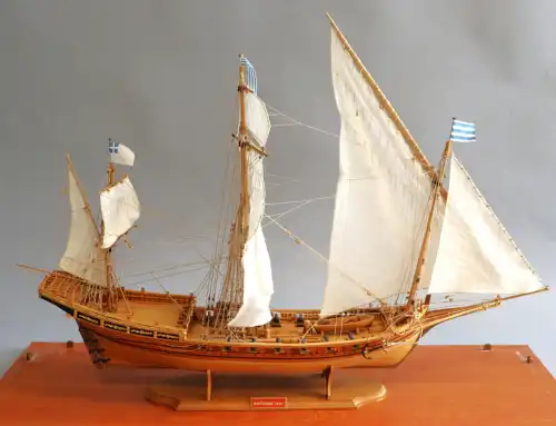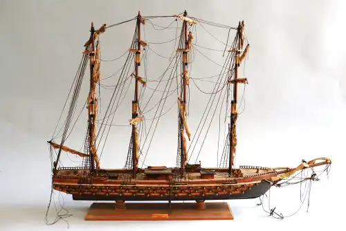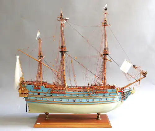 Maquette du voilier Misticque, 1750, trois mâts, équipé de canons et barque. H.: 50 cm - L.: 70 cm. Avec protection en plexiglass.