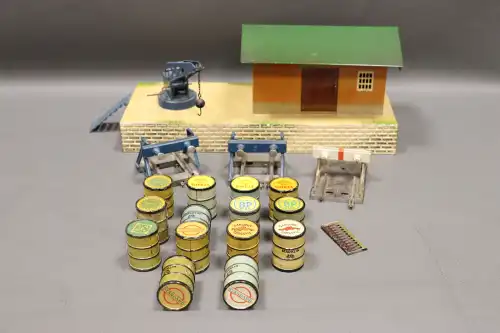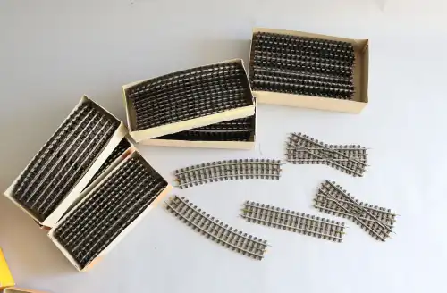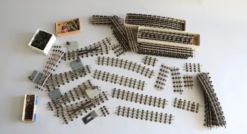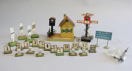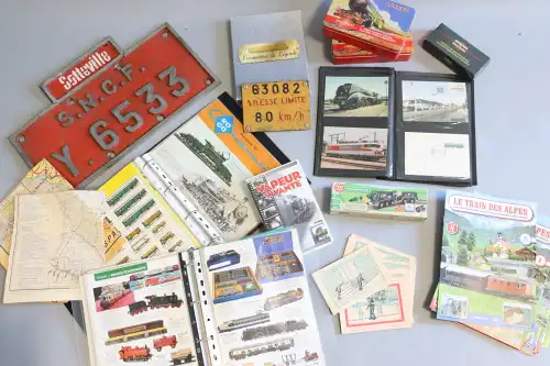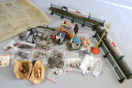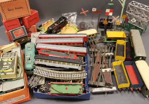 Fort lot d'équipements et accessoires pour trains miniatures, comprenant : rails, signalitiques, wagons, locomotives, passages à niveaux et moteur mécanique. Dont : TRAINS HORNBY, LIMA, SNCF.