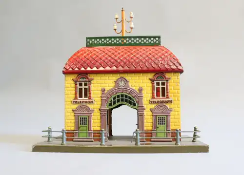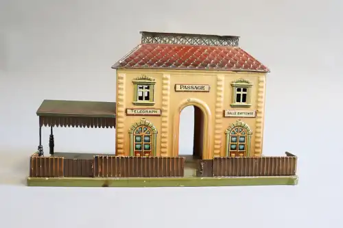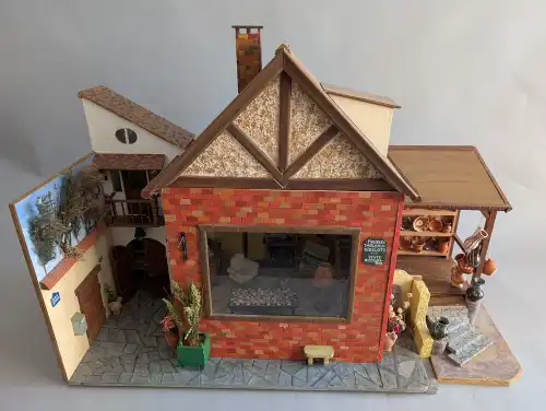 Maison en bois peint, avec atelier de menuiserie atenant et échoppe de vente de poteries. Electrifiée. De nombreux éléments de décor, de meubles miniatures ainsi que des petites céramiques. H.: 67 cm - L.: 107 cm - P.: 40 cm