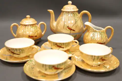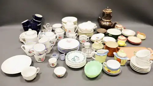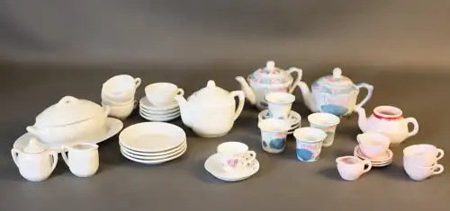 Pièces de dinette en céramique comprenant 4 modèles différents : 4 théières, 12 tasses, 15 assiettes et sous-tasses, un légumier, 2 pots à lait, 1 pot à sucre et un plat oval.