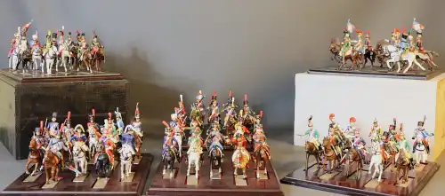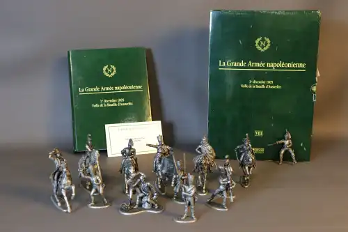 On joint : 3 boîtes de Campagnes 14-18 EDITIONS ATLAS, en zamac comprenant un caisson à munition et un pourvoyeur de crapouillot, un canon de 75 et le servant de crapouillot, un brigadier d'artillerie de 1914 et le cheval d'attelage.