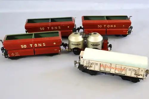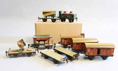 JOUEF, lot comprenant 1 locomotive motrice réf 853900, 1 locomotive vapeur réf 850300 , et 12 wagons transport, en boite plastique, en l'état.