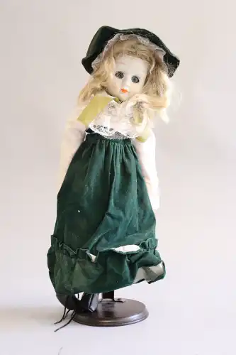 Poupée articulée en plastique dur sur socle, avec ombrelle et chapeau. Yeux fixes, bouche fermée.