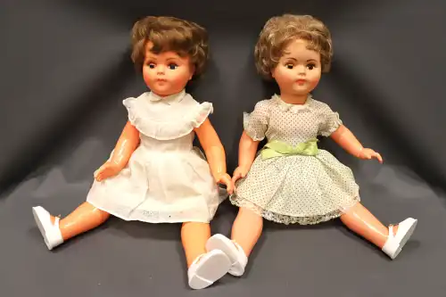 Deux poupées celluloïd, l'une anciennement parlante, yeux dormeurs, yeux dormeurs, sans marque apparente. Taille : 46 et 52 cm. En l'état
