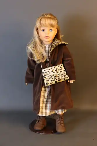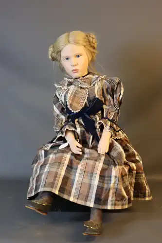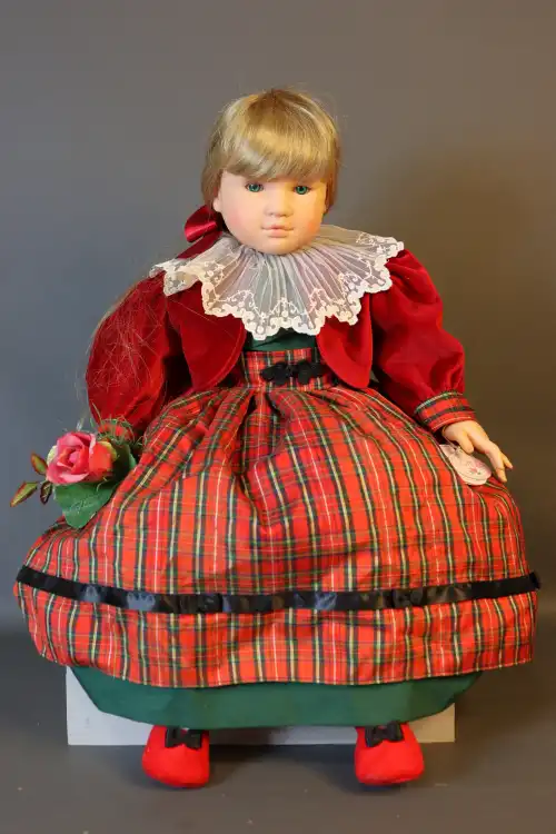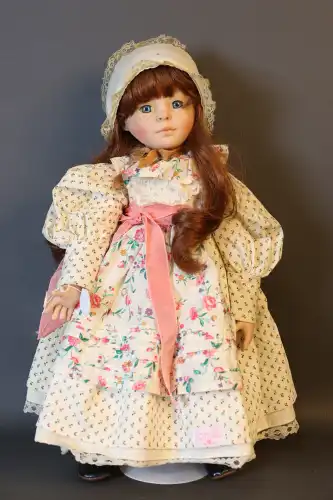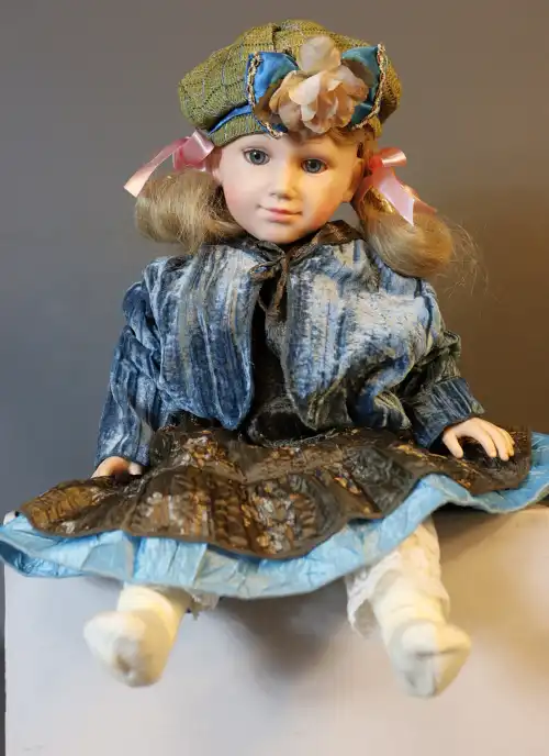 COROLLE. Poupée de collection en plastique dur à robe kaki et bleue avec chapeau, création Catherine Refabert. En position assise, yeux fixes bleu avec cils. Numérotée 768 dans le dos. Moule : "Corolle 1993 93-10-F20E". Taille : 54 cm