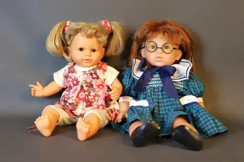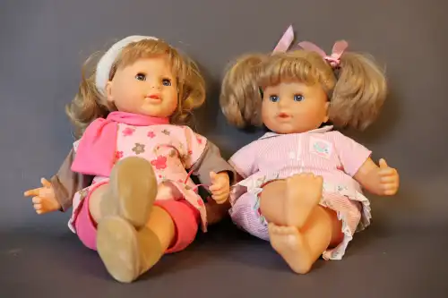 COROLLE. Lot de deux poupées en plastique dur, yeux dormeurs bleus à cils, bouches ouvertes, corps semi-articulés. Moules "Corolle S-3-M10-2006" pour l'une et "S-10J-14 2000" pour l'autre. Taille : 39 cm
