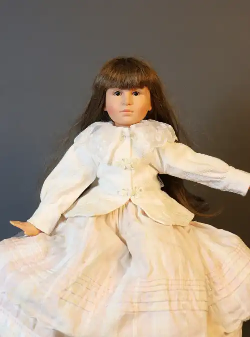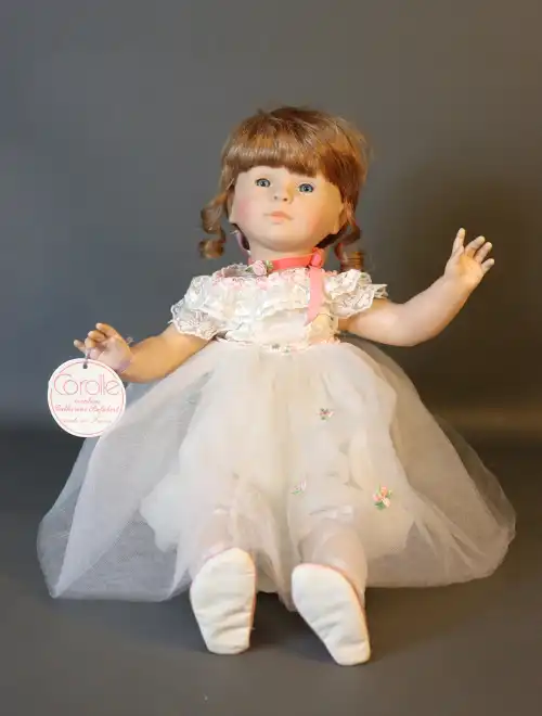 COROLLE. Poupée de collection en plastique dur à robe blanche fleurie, création Catherine Refabert, circa 1991. Yeux fixes bleus avec cils, bouche fermée, corps semi-articulé. Jambes légèrement pliées. Numérotée 1863 dans le dos. Taille : 55 cm environ