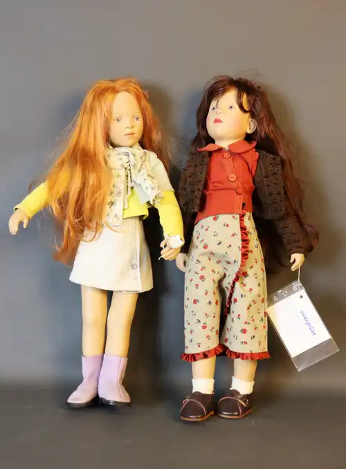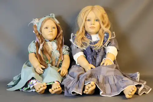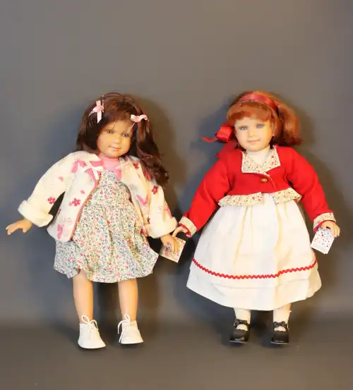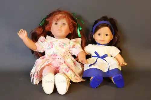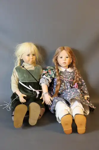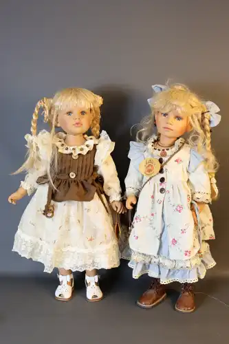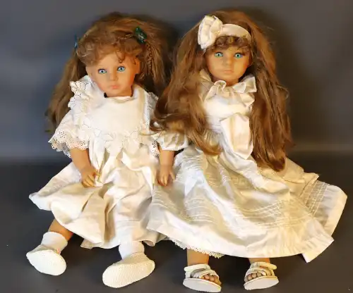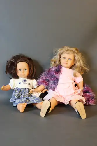 PAOLA REINA. Lot de deux poupées. Plastique dur, moule "Hello Heidi v.16 Ruth Treffeisen", perruque, yeux fixes bleus avec cils, corps semi-articulé. Taille : 47 cm (en l'état)