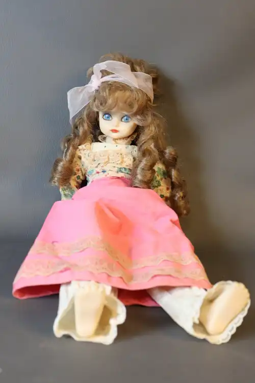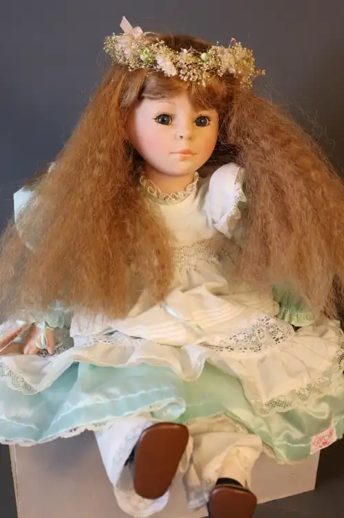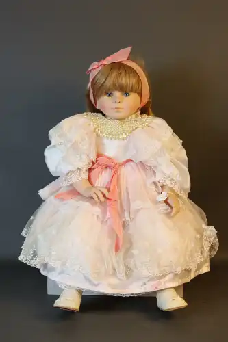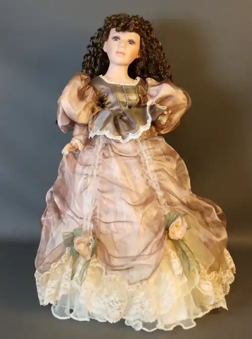 Poupée de collection en porcelaine en robe de princesse. Pieds à escarpins à talon. Yeux fixes avec cils, bouche fermée.