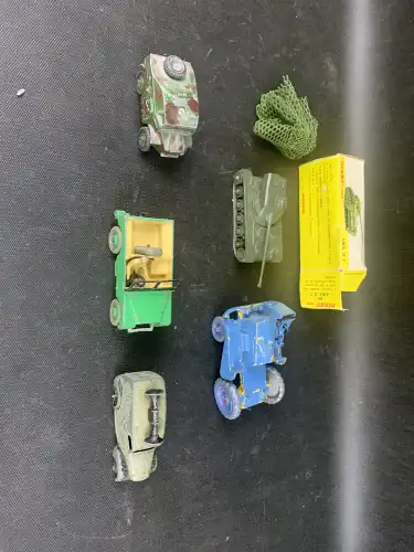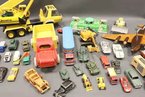 Fort lot de véhicules miniatures : voitures, camions, avion, mini-pelle, chars..., dont : DINKY TOYS, MATCHBOX, HUSKY, CORGI, JOUSTRA GOLIATH.