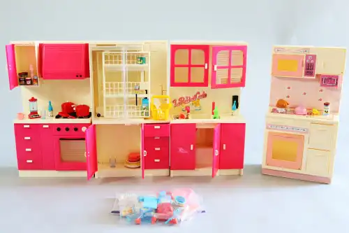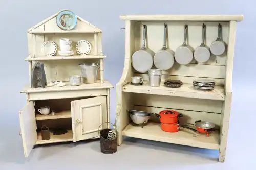 Joint : un lot d'accessoires pour cuisiner, comprenant : une dinette, casseroles, marmites, assiettes, théière, petits plats en métal, etc.