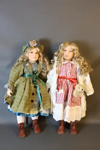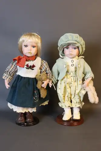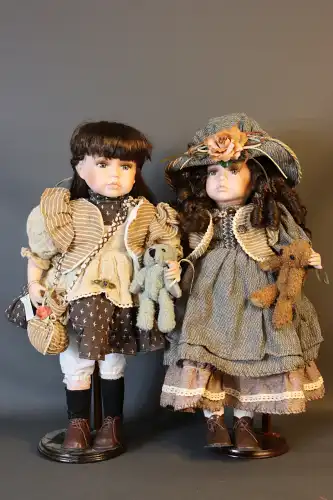 Lot de 2 poupées de collection en porcelaine sur socle, avec oursons, besace et un chapeau. Yeux fixes avec cils, bouche fermée.