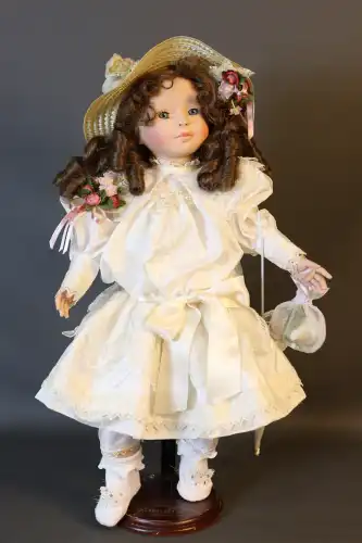 COROLLE. Création Catherine Refabert. Poupée de collection CR CLUB DE COROLLE N° 652/1993. Mariée en plastique dur, sur socle Mundia, avec besace, ombrelle et chapeau fleuri.
