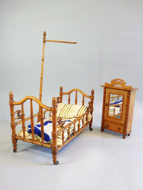 Lot de mobilier miniature en bois imitation bambou, comprenant : une armoire avec miroir et tiroir (H.: 41 cm. L.: 21 cm. P.: 9 cm) et un lit sur roulettes. (55 x 27 cm - H.: 69 cm environ)