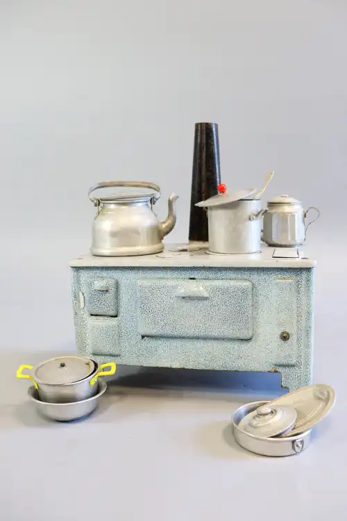 BABY BAUDIN. Gazinière à bois miniature en fonte émaillée bleue avec accessoires. P. : 19 cm. L. : 32 cm. H. : 38 cm environ (avec cheminée)
