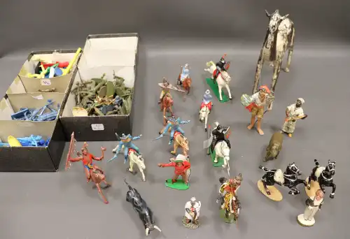 Fort lot de diverses miniatures en plomb, métal et celluloïde, dont soldats, chevaliers, animaux, cowboys et indiens.