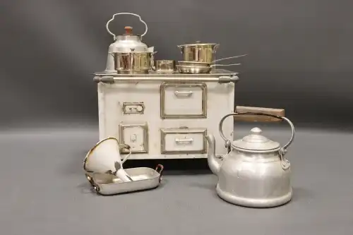 Cuisinière d'enfant en métal émaillé blanc. Avec quelques ustensiles de cuisine. H.: 17 cm - L.: 13 cm - P.: 17 cm
