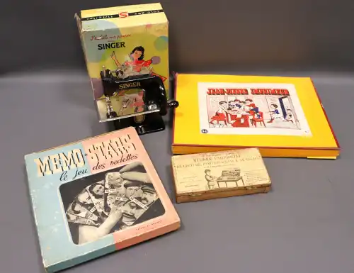 Lot divers jeux sous boite comprenant : - SINGER. Machine à coudre en métal noir laqué ;
