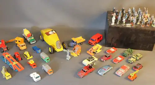 Lot de véhicules (voitures, camions, mini-pelle...) et de soldats en métal. (Quelques manques, usures, état d'usage).