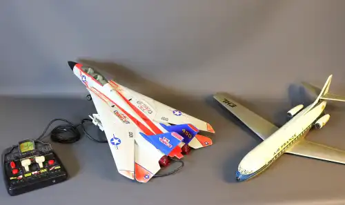 Lot de deux avions dont un télécommandé (filaire) : NEW BRIGHT (avion de la navy F14 TOM CAT, télécommande pile AA, 1990) et une reproduction d'un avion AIR FRANCE Caravelle. (Quelques fissures et salissures sur la coque.