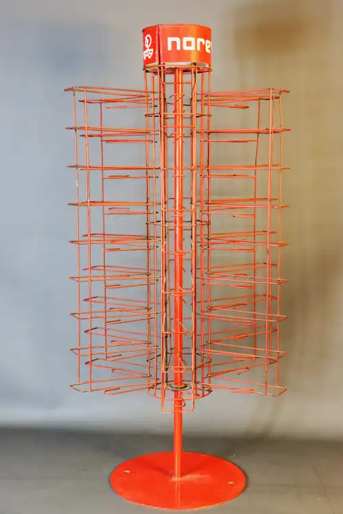 NOREV. Présentoir tournant en métal rouge pouvant contenir 48 voitures. Présente des traces de rouille.