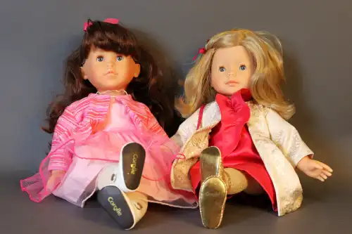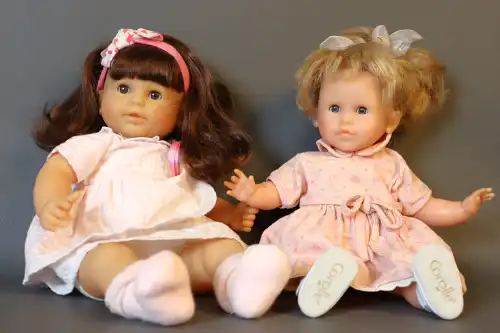 COROLLE. Lot de deux poupées en plastique dur dans leur boîte d'origine, yeux dormeurs bleus à cils, bouche fermée, corps semi-articulé. Taille : 42 cm