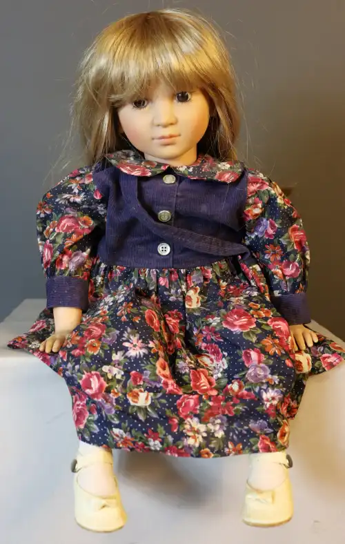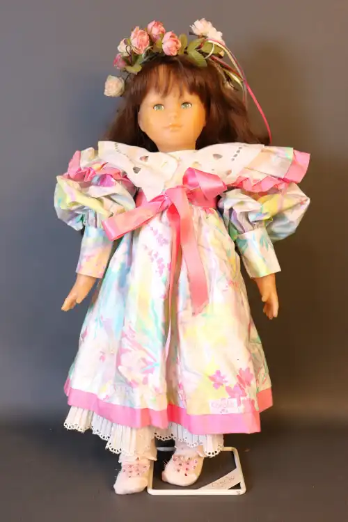 COROLLE. Poupée de collection en plastique dur à robe fleurie violette avec sac-pochette, création Catherine Refabert. En position assise, yeux fixes bruns avec cils, bouche fermée. Numérotée 524 sur le dos. Moule : "Corolle 94 E1". Taille : 46 cm