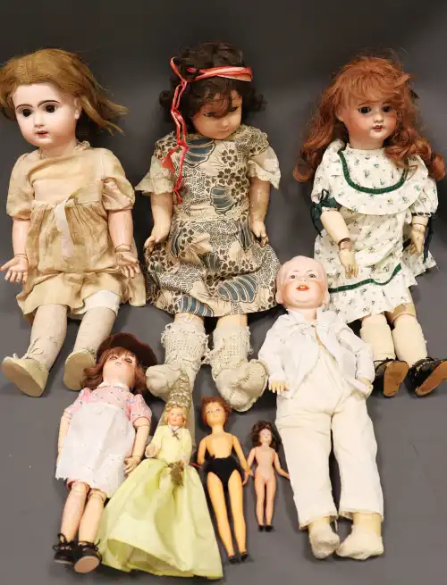 Lot de huit poupées en porcelaine et plastique, dont quatre articulées, deux signées SFBJ.