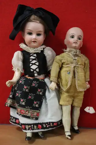 Lot de deux poupées tête porcelaine : - ARMAND MARSEILLE, moule 390, petite poupée en costume traditionnel alsacien, yeux dormeurs, bouche ouverte sur quenottes. H.: 21 cm