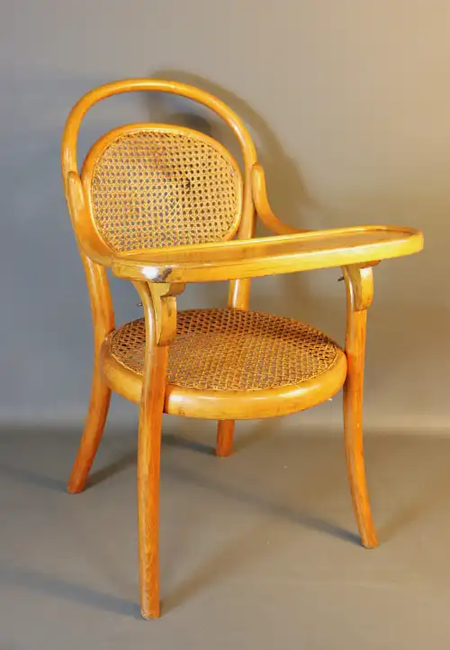 Chaise d'enfant avec petite tablette amovible en bois cintré, le dossier et l'assise cannés.