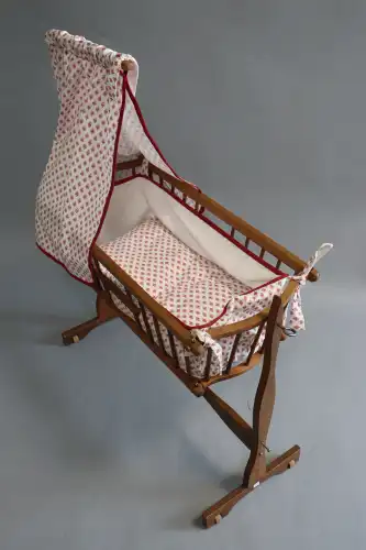 Berceau de poupée à roulettes en bois naturel avec matelas et draps. (Usure, une vis à remettre, le baldaquin à refixer)