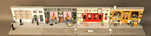 Lot de devantures de magasins avec routes et trottoirs : Grand Rex Paris, boulangerie Epis d'Or, Chez Marie, commissariat, avec personnages et signalitiques.