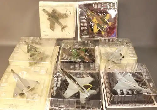 Lot de 8 avions militaires sous boîte, dont : ROYAL MACES, EURO FIGHTER EF 2000A TYPHON, MC DONNEL DOUGLAS F4D PHANTOM II...