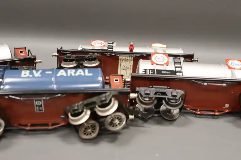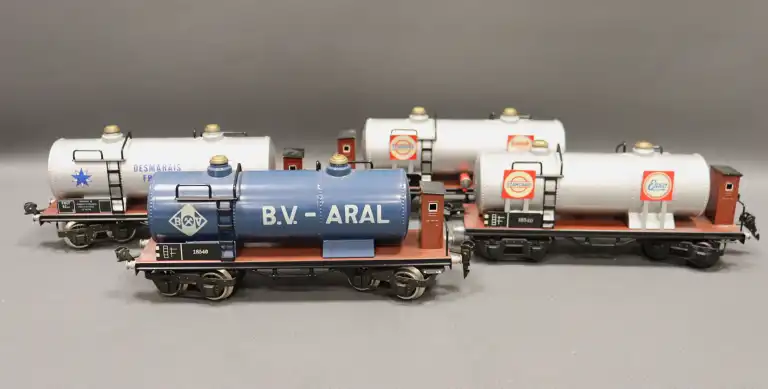 HEHR (réplica Märklin). Lot de quatre wagons-citernes publicitaires, dont DESMARAIS FRERES, ESSO, et BV., numérotés 1854 et 18540.