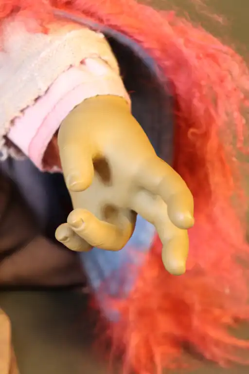 Taille 90 cm. Perruque partiellement décolée, en l'état.