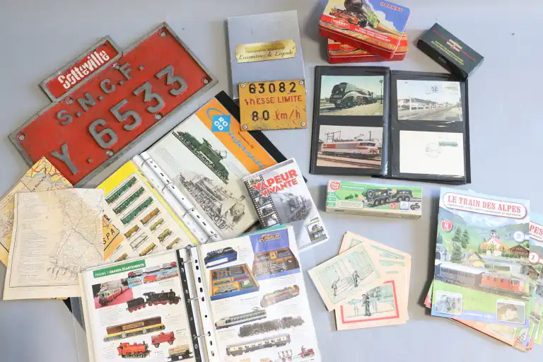 Lot divers sur le thème des chemins de fer comprenant : - Deux plaques métalliques dont une pour limitation de vitesse et une plaque SNCF de "Sotteville"