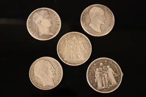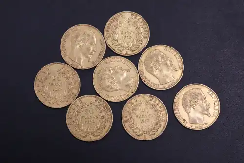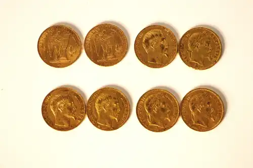 Lot de 8 pièces de 20 Francs or Napoléon III et IIIème République : 1858, 1859, 1860, 1863, 1866 x 2, 1877 et 1878.