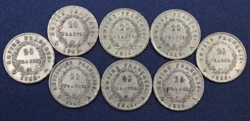 Lot de 8 pièces de 20 Francs or Napoléon Premier de 1807, 1809, 1811, 1812 (4) et 1815.