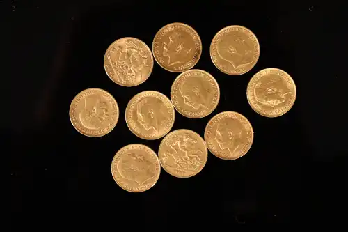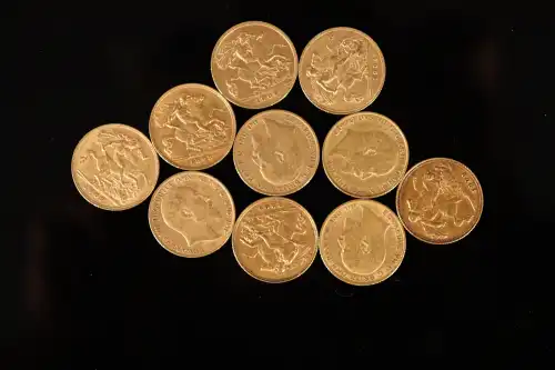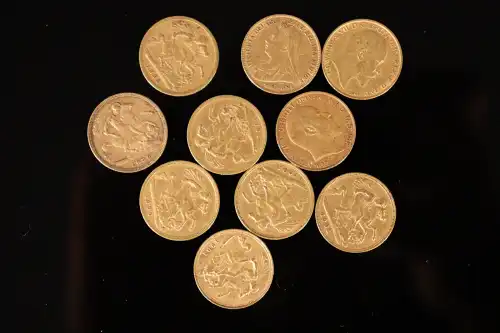 Lot de 10 pièces de demi-souverain en or de 1910 (2), 1911 (2), 1912, 1914 (2), 1915 (2), 1918.