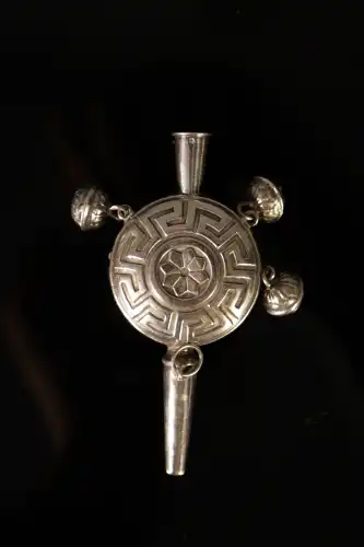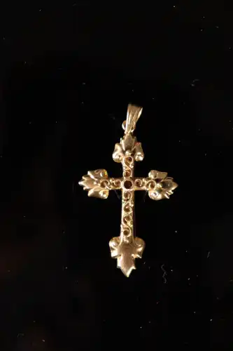 Pendentif croix en or jaune 18 K (750) à motif d'entrelacs appliqués en filigrane et serti d'un petit rubis. Poids brut : 2.70 g