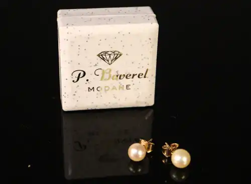 Paire de puces d'oreilles en or 18 K (750) ornées d'une perle de culture, l'une légèrement rosée. Poids brut : 1.47 g
