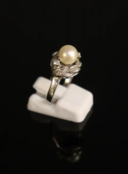 Bague en or gris 18 K (750) ornée d'une perle épaulée de deux petits diamants, à décor d'une frise stylisée en pourtour serties de petits diamants taillés en rose. TDD : 53. Poids brut : 5.17 g