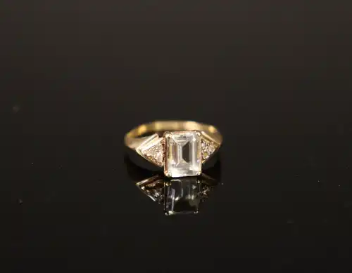 Bague en or 9 K (375) sertie d'une pierre bleue pâle probablement aigue-marine en taille émeraude épaulée de cinq petits diamants (un diamant manquant). TDD : 51. Poids brut : 1.94 g