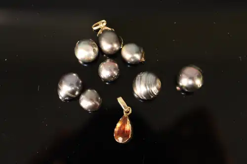 Lot de deux pendentifs à montures en or : - L'un orné d'une perle grise de Tahiti avec monture en or jaune 18 K (750). Poids brut : 2.81 g