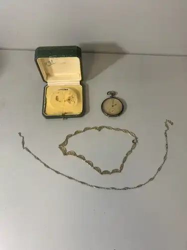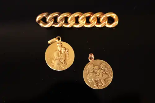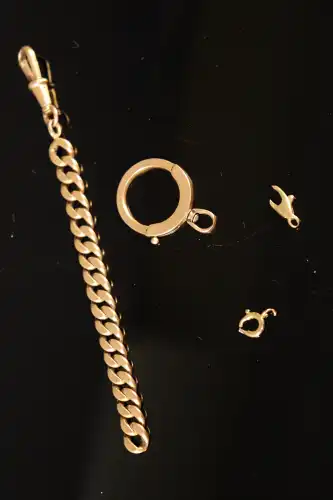 Lot en or jaune 18 K (750) composé de deux fermoirs cassés, un fermoir de montre à gousset avec sa chaîne. Poids : 10.50 g
